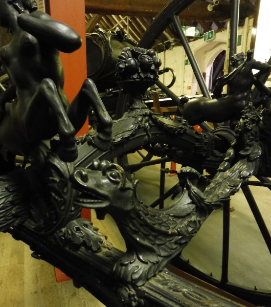 Behind the seat the carvings are so busy that it is difficult to know where to look. The axle is compassed up and carved with trophies, ribbons and acanthus leaves. Surmounted on the top of the axle is a bowl of fruit and flowers. Just in front of the axle is a cross bar of garlands and leaves which finish in heads of fantastic scaly beasts, they swing from one side to the other and attach themselves to the shafts. At the rear end of the shafts, and on each side, are centaurs appearing to jump over the axle. One is male and the other female. They are very animated and the carver shows a knowledge of the anatomy of equines.