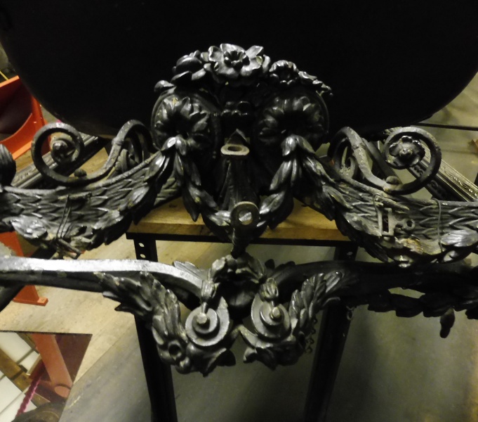 The footboard and dash board are like something from a Disney film, both are carved to look like a piece of paper with selected edges curling round as if having been rolled up. The dashboard has swags of fruit and flowers along the top edge and a scallop shell motif in the centre with and acanthus leave and further swags decoratively attaching it to the footboard. Very ornate scrolled iron brackets attach the two structurally.