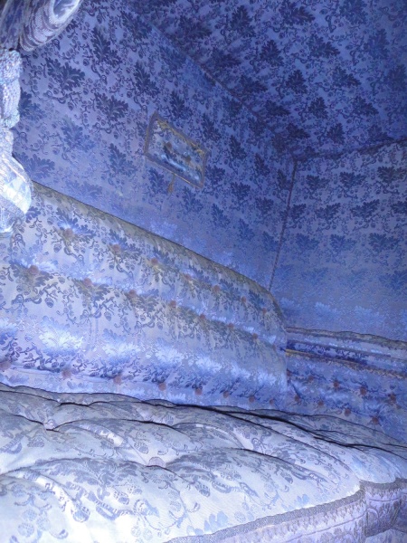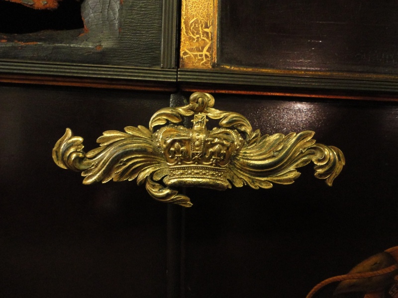 The doors are hung on concealed hinges. They have a cast gilt handle with the Royal Crown in the centre and acanthus leaves to each side. There are lowering windows in each door with frames covered in blue cloth. Inside the upholstery is what one would expect of a 19th century Royal carriage, Royal blue silk with an oak leaf design. Every surface is covered with the same stunning material. The laces are in the same colour with a similar oak leaf design to that of the silk. At the large rectangular window in the front of the leather head is a blue silk roller blind. A small rectangular window is in the back of the head, this has a silk covered squab. To access the carriage are folding steps on each side with blue silk covered backs. All of the interior furniture is made of bone.