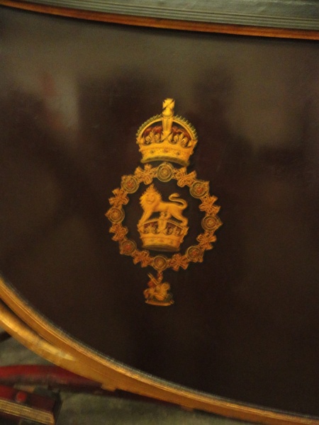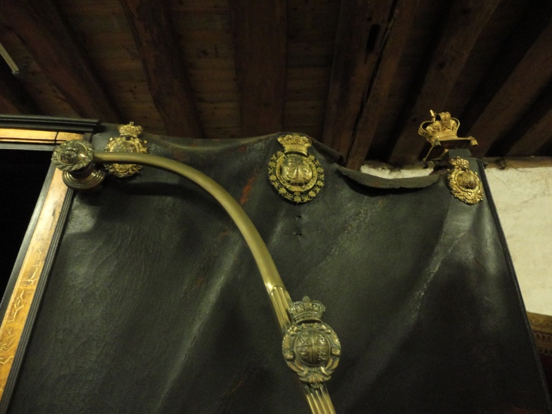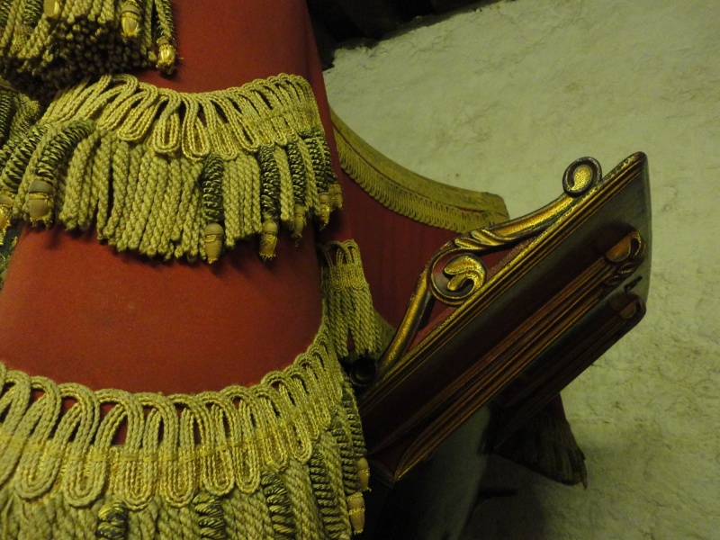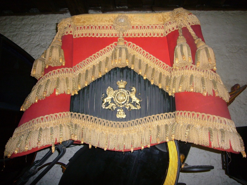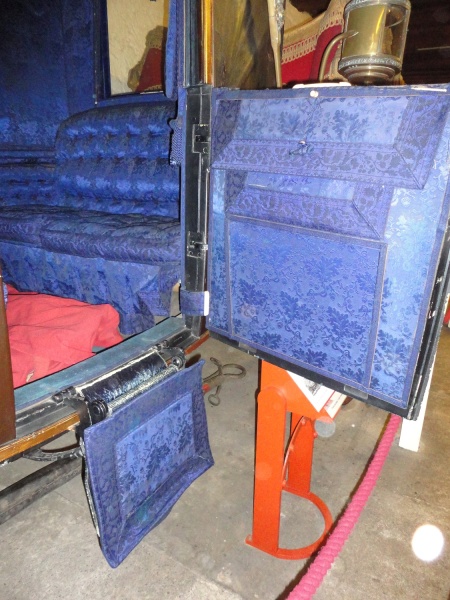 The front of the carriage has a Salisbury boot which supports the coachman’s seat. The seat is covered with a hammer cloth with a red box cloth ground material. The lower side panel is covered in blue pleated silk and has a gilt metal Royal Coat of Arms in the centre. The fringing is in gold with drops that finish with an acorn. Much of the silk on the drops has disintergrated but the rest of the fringe and the red box cloth has stood the test of time well.