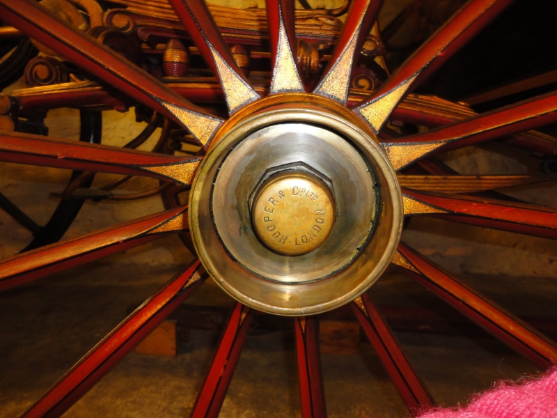 At the front of this Landau are 12 spoke English pattern wheels with iron tyres, there are 14 spokes on the rear wheels. The carriage has collinge patent axles and straight axles. The wheel hubs and axle caps are in brass.