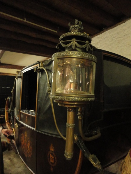 This carriage retains its original lamps that are on fixed brackets. The lamps are elaborate with cast edges to the edge of the single tiered chimney and around the cylindrical frame. The candle holder has cast collars. Just beneath the chimney is a garland of oak (?) leaves and a Royal crown surmounts the lamp.