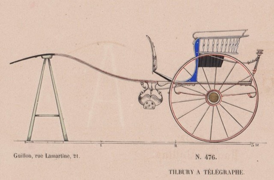 A French design for a Tilbury Gig. The defining feature of this carriage is the spring system at the back. The Tilbury Gig was designed by Lord Stanhope.