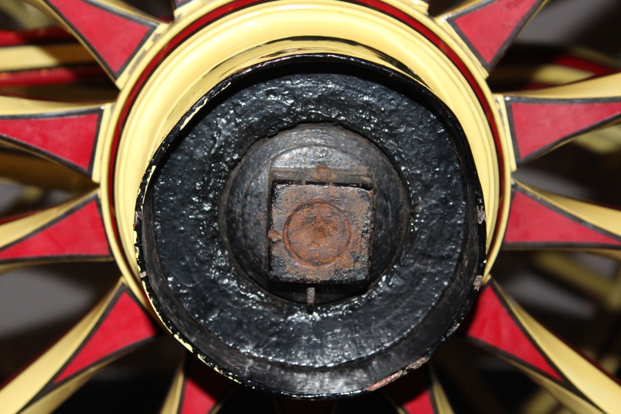 The wheels are secured on common grease axles with square nuts and linch pins. The front axle is straight and the rear compassed up. To the front are 12 spoke English pattern wheels and 14 spoke to the rear, all iron shod.