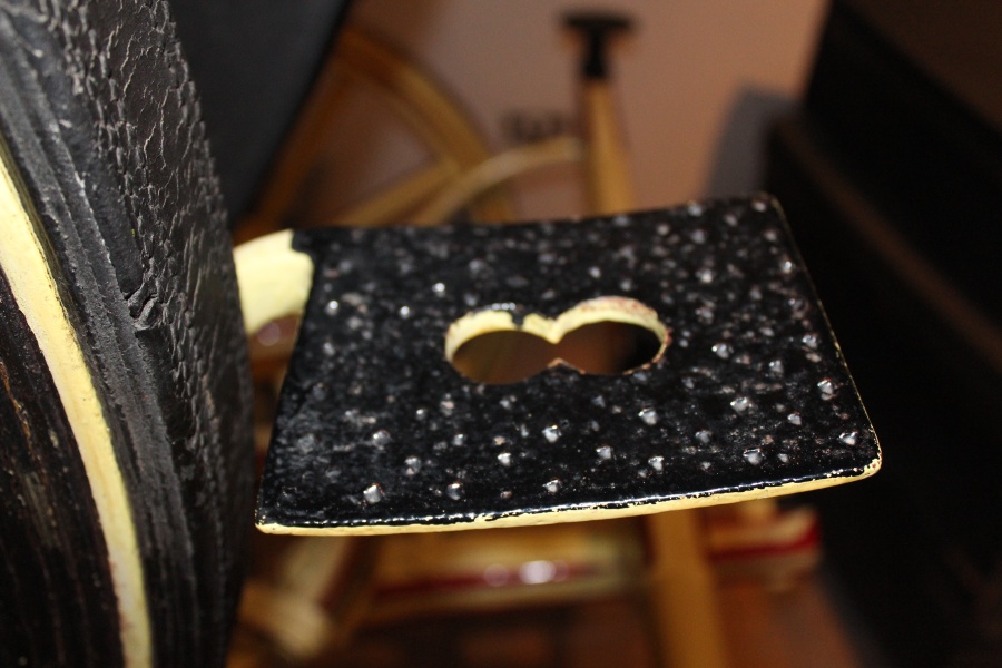 To access the carriage are double folding steps served with black leather, carpet and red and gold seaming lace. When a coachman’s seat is in place the steps mounted to the fore carriage that sit half way up the Whip springs could be used to mount the carriage. They consist of a rectangular jagged tread with a hole in the centre in the shape of a figure of eight. At the back are two steps with rectangular jagged treads and rounded corners. They are bolted to the near side of the hind spring bed.