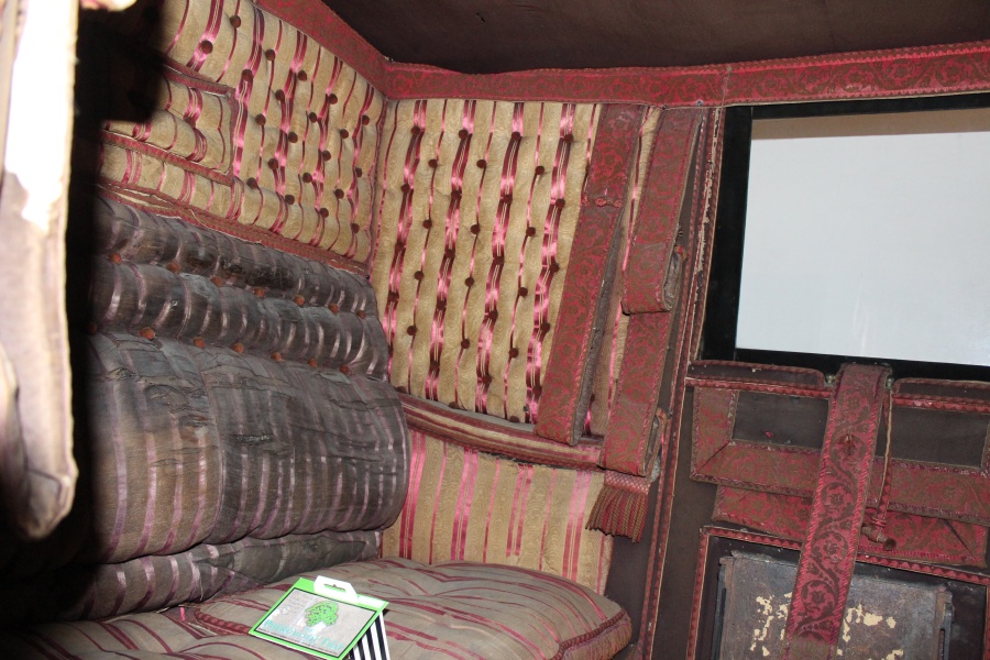 Inside this chariot is a delight with a beautiful interior of cream/gold and red striped silk. The colour on the buttoned side and rear panels and on the seat cushions has remained fairly vibrant but it has faded to brown on the seat back. A neat little buttoned squab covers the rear window. Covering the roof, front panel and the doors is a brown wool cloth. The red worsted broadlace carries a scrolling floral motif. This forms the swing holders (which are leather backed) and surrounds the door pockets and the roof edge. Red and gold seaming lace edges the seat cushions, fringes in the same colours finish the swing holders and the window glass strings. One pink Venetian blind still hangs at the nearside door the rest are missing. Covering the floor is a pink and maroon wool carpet.