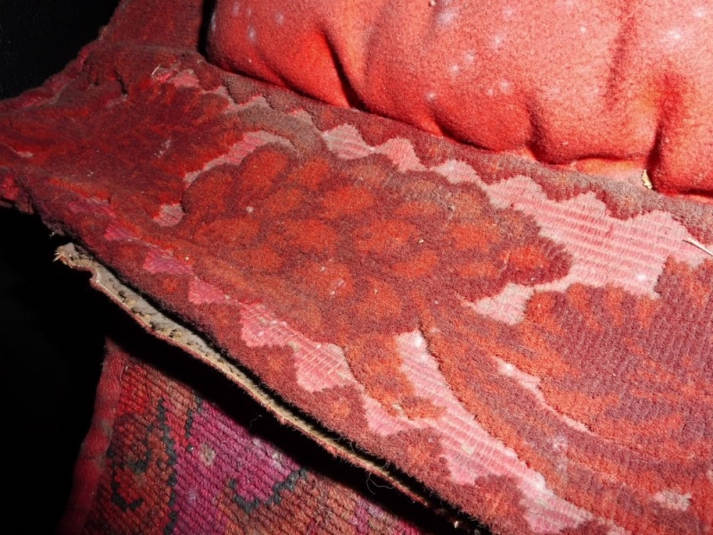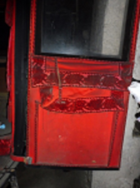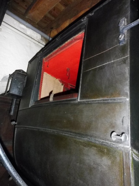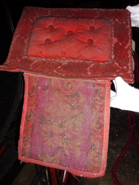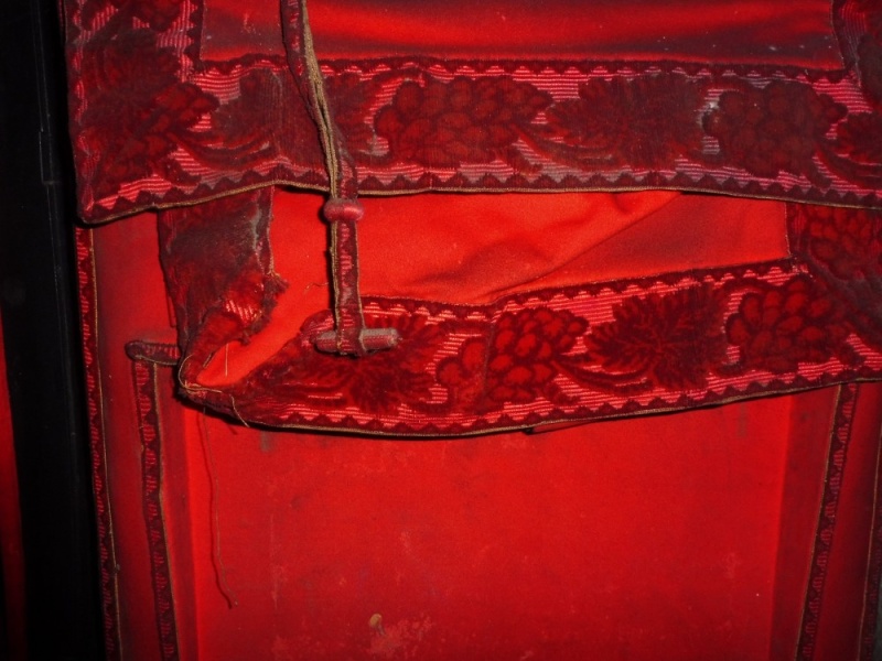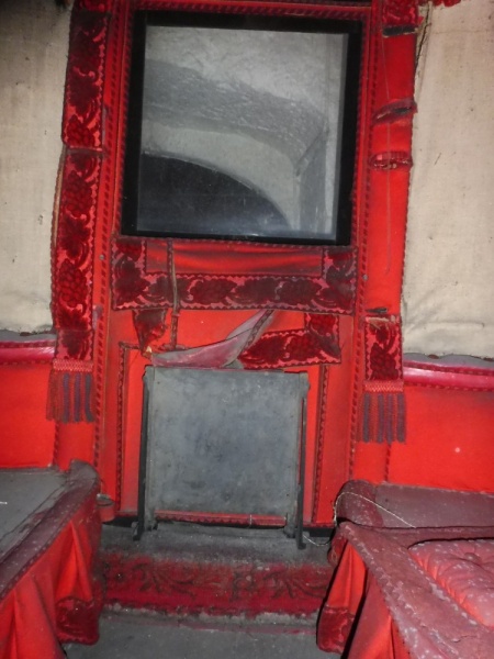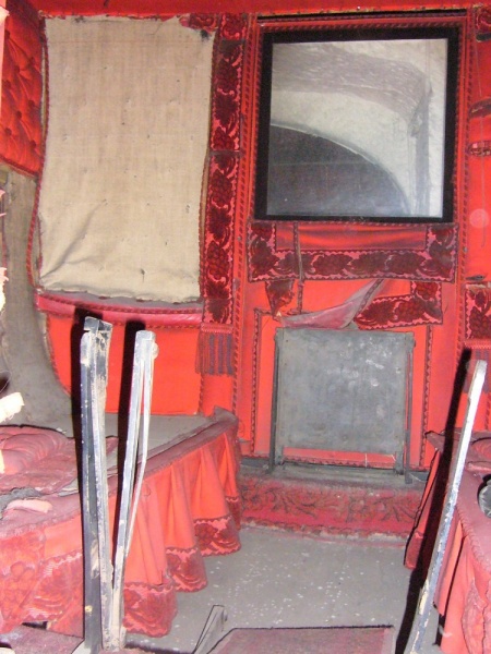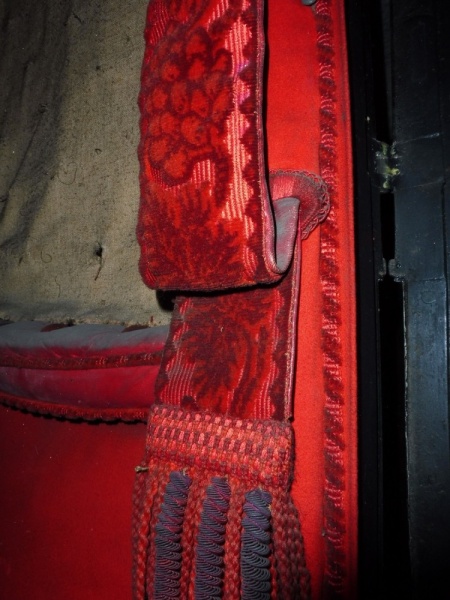 Whilst the exterior has escaped any damage, the interior has sadly been vandalised with areas of textile having been literally ripped out. The upholstery that remains reveals what was once a very beautiful interior. A wool cloth of a startlingly bright scarlet lines the side panels and forms the seat valances. The broadlace is of the most expensive variety with a deep plush and a pattern of grapes and vines all in bright red. The fringes are red and brilliant blue silk. On the steps are deep buttoned squabs edged with the broadlace and a cut pile carpet of a foliate design in red, gold, black and cerise pink. Red jacquard seaming lace borders the doors and window frames.