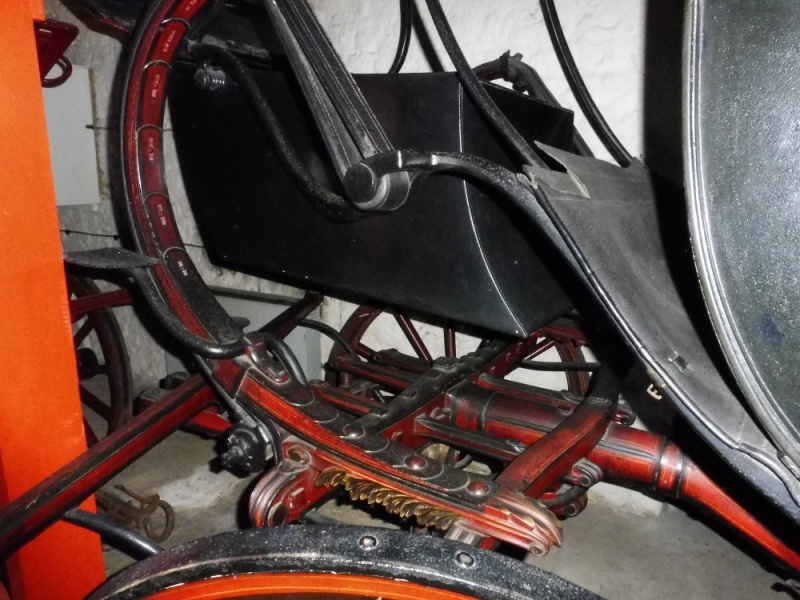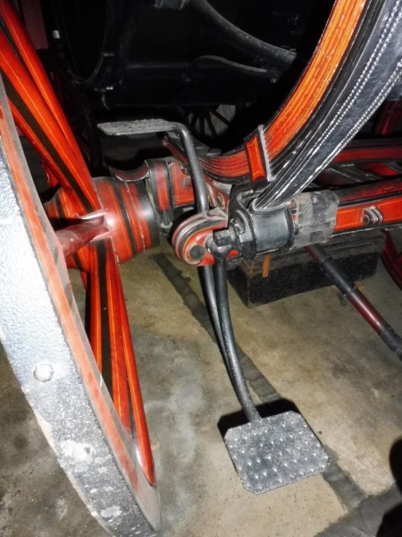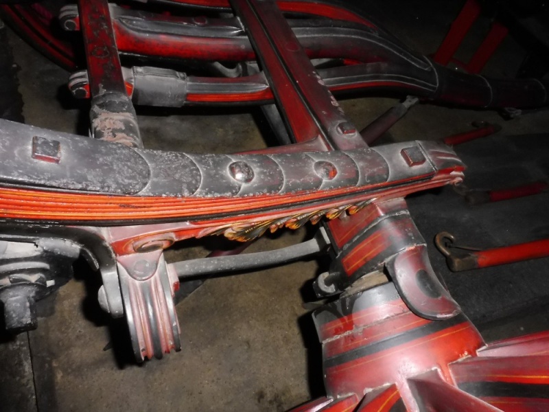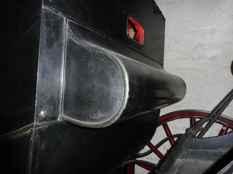 This coach shows evidence of some vandalism as the folding steps used to access the inside have been bent and broken to the point where they will not fold down. Mounted on the C springs at the front are steps (one each side) for the coachman to access the box seat. They are on a plain bracket with a rectangular jagged plate. The roller bolts have jagged upper sides for use as steps. Two steps are fitted to the hind carriage both with rectangular jagged steps.