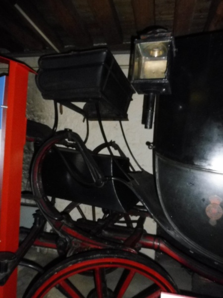 A Travelling Coach for a team of four or six horses in original unused condition. The coach has a coachman's seat and a rumble seat, is sprung on C springs and painted in green and black with red undercarriage and black and yellow lining. The interior is a shadow of its former splendour of brilliant red wool cloth and broadlace.