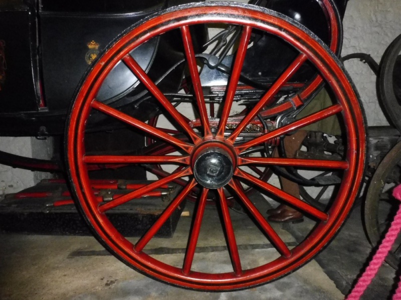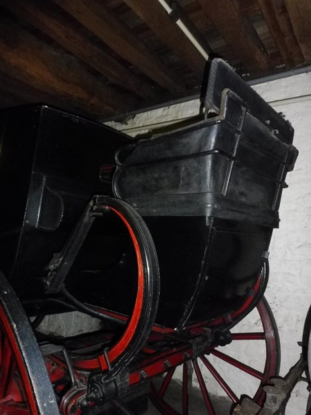 The upper body panels, dumb irons, coachman’s and rumble seat are painted black. The lower body panels are dark green. The forecarriage, hindcariage, perch and springs are painted red with black and yellow lining. On each door is a large family crest with smaller motifs on the lower body panels.