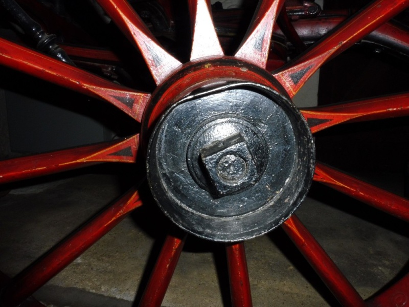 In front this coach has 12 spoke English pattern wheels and 14 spoke behind on common axles. The iron tyres are the original and have no wear at all on them at all with the coach having been stood in a coach house and never used. The coach is sprung on C springs front and back with tightening ratchets.
