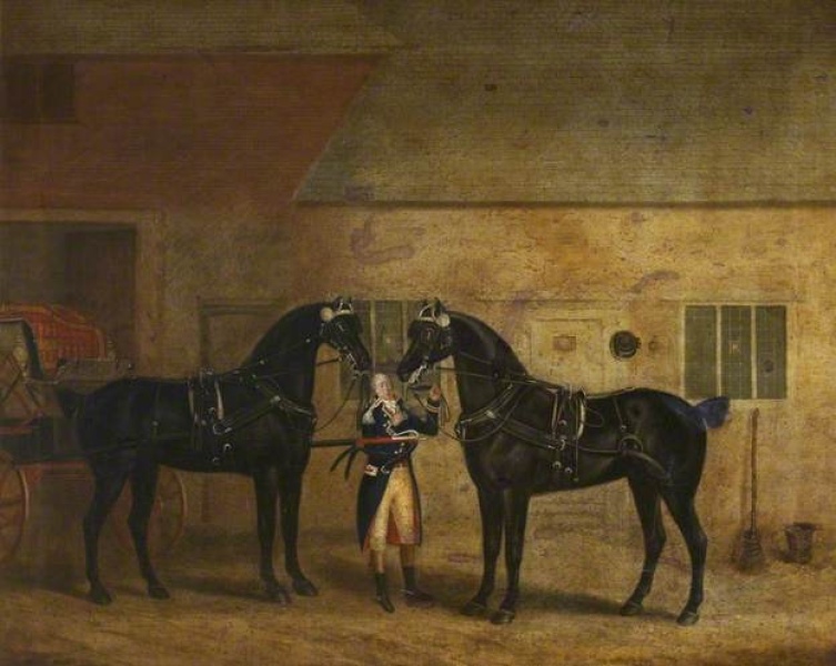 Oil on canvas painting of two black carriage horses standing in a stable yard. A groom is harnessing them to a carriage. Painted by Francis Sartorius (1734-1804).