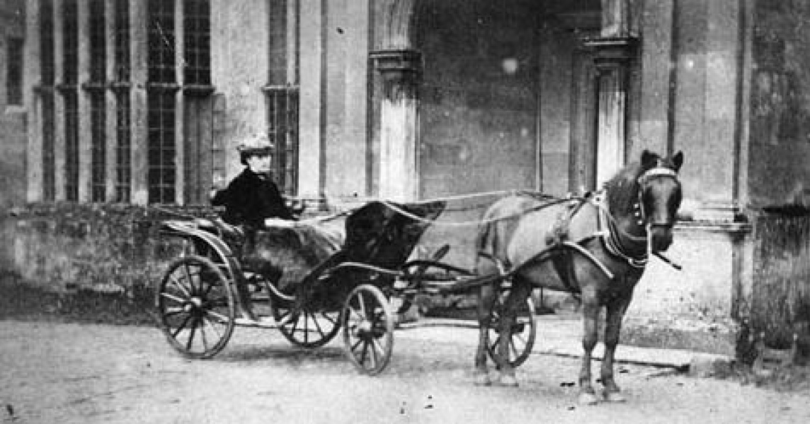 A Victorian lady sits in her Pony Phaeton outside of a country house.